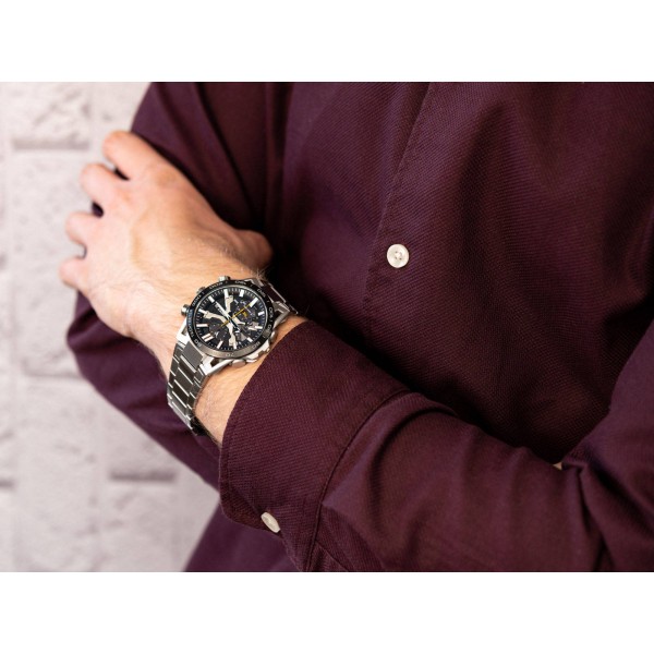 Casio Edifice EQB-2000DB-1AERсучасний годинник на браслеті. Натхненням для проекту стала надзвичайно міцна конструкція підвісок для гоночних автомобілів. Конверт, оздоблений спеціальними дужками, надає всій конструкції легкості. Крім бездоганного зовнішнього вигляду, Casio EQB-2000DB-1A наповнений низкою корисних функцій. Сонячна технологія , вбудований Bluetooth і стійке до подряпин сапфірове скло для захисту циферблата – усе це розміщено у тонкому корпусі . Щоб легко керувати налаштуваннями світового часу, будильника або секундоміра, просто натисніть програми на своєму смартфоні. Водонепроникність K100M дозволяє плавати з годинником на руці, не турбуючись про затоплення. Однак пам’ятайте, що не можна використовувати кнопки під водою. Модель EQB 2000DB була створена з використанням компонентів найвищої якості, а її дизайн надає годиннику справжній дух автоспорту.