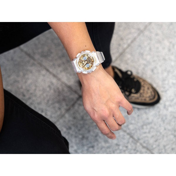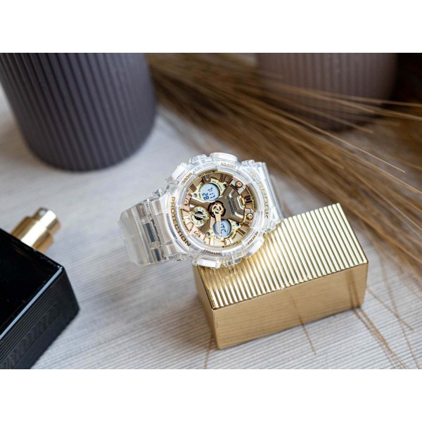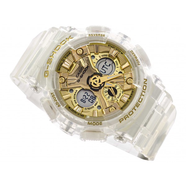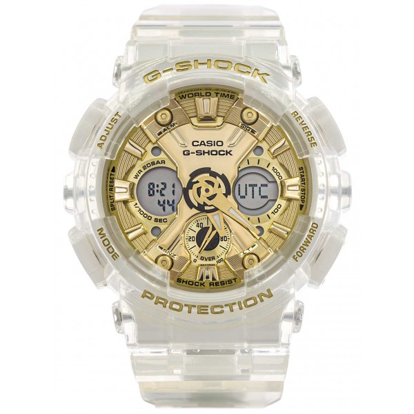 CASIO G-SHOCK GMA-S120SG-7AER – ідеальний компаньйон для сучасних жінок, які цінують не лише стиль, а й функціональність. Прозорість, яка використовується в годиннику, була популярною в 1990-х роках і залишається такою досі. Золотий циферблат додає елегантності, а також має функцію світового часу, що ідеально підходить для мандрівників. Крім того, секундомір і таймер роблять годинник зручним для щоденного використання. Ця модель характеризується дуже високою стійкістю до ударів і ударів. Клас водонепроникності 200M дозволяє безпечно займатися водними видами спорту. G-SHOCK GMA-S120SG-7 додає елегантності та характеру будь-якому стилю, і водночас допомагає в плануванні часу та діяльності.
