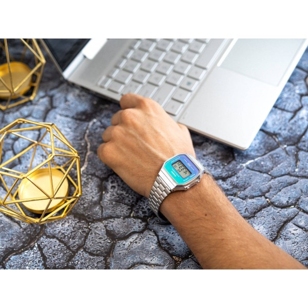 Casio A168WER-2AEF припаде до смаку любителям ретро стилю. Частина циферблата навколо цифрового дисплея прикрашена візерунком омбре, поєднанням зеленого та фіолетового. Сталевий браслет можна регулювати без необхідності відвідування годинникаря, пересуваючи застібку. Виробник оснастив Casio A168WER-2A багатьма корисними функціями, такими як відображення дати, будильник і секундомір. У темряві зчитувати час буде легше завдяки світлодіодному підсвічуванню. У годиннику використовується японський кварцовий механізм, який працює від акумулятора. Точність механізму +/- 30 секунд на місяць. Варто відзначити, що виробником заявлений термін служби батареї близько 7 років. Якщо ви шукаєте годинник, який стане стильним повсякденним аксесуаром, Casio з серії Vintage стане ідеальним вибором.