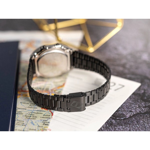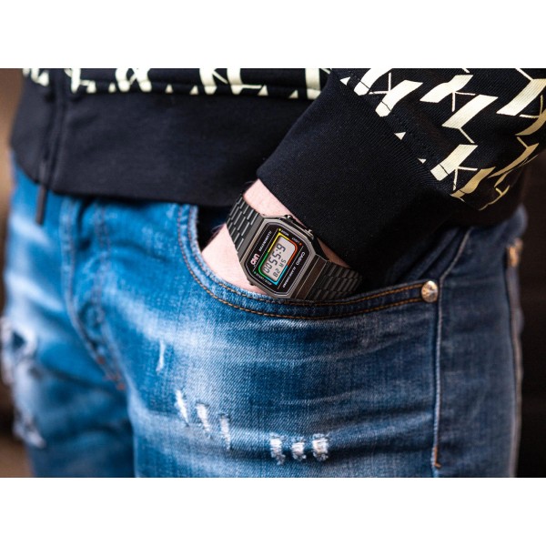 Відкрийте для себе унікальну версію годинника, яка поєднує культовий дизайн Casio з унікальною атмосферою карткової гри UNO від Mattel. Модель Casio A168WEUC-1AER Uno Collaboration - це пропозиція для любителів ретро-стилю та функціональних аксесуарів, створена для людей, які цінують естетику та практичність. Заснований на класичній вінтажній моделі A168, це обмежене видання віддає шану легендарному дизайну гри 1979 року. Циферблат вражає кольорами, натхненними всемогутньою дикою картою, представляючи рамку дисплея, виділену інтенсивним червоним, насиченим синім, енергійним жовтим і свіжим зеленим. Коли підсвічування активовано, на РК-дисплеї з’являється характерне слово «Wild», що підсилює захват від динамічного ігрового процесу. Крім того, оригінальний логотип UNO, розміщений на циферблаті, є тонким акцентом, який підкреслює унікальність цієї моделі. Дизайн годинника доповнює сірий корпус з іонним покриттям, який ідеально доповнює матовий чорний браслет. Браслет виготовлений з нержавіючої сталі і має практичну застібку, що дозволяє швидко відрегулювати окружність відповідно до ваших індивідуальних потреб, позбавляючи від необхідності відвідувати годинникаря. Пряжка була збагачена тонким гравіюванням зворотної сторони картки UNO. На обкладинці зображені мотиви, що відсилають до гри UNO, де крім логотипу UNO є три карти (1, 6 і 8), що символічно вказують на номер моделі. Годинник не тільки чудово виглядає, але й пропонує низку функцій, які полегшують щоденне використання. Великий Календар надає інформацію про поточний день місяця, назву дня тижня та місяця, тоді як точний Секундомір вимірює час з точністю до однієї сотої секунди. Всі ці елементи дозволяють пристрою ідеально поєднувати традиційний вигляд із сучасною функціональністю. Все це доповнює екологічно чиста упаковка, виготовлена з перероблених матеріалів, прикрашена класичними кольорами UNO. Це унікальне поєднання дизайну та турботи про навколишнє середовище підкреслює прихильність обох брендів – Casio та Mattel – які радують своїх шанувальників у всьому світі з 1970-х років. Casio A168WEUC-1AER Uno Collaboration – ідеальний вибір як для чоловіків, так і для жінок, які шукають оригінальні, функціональні аксесуари у вінтажному стилі.